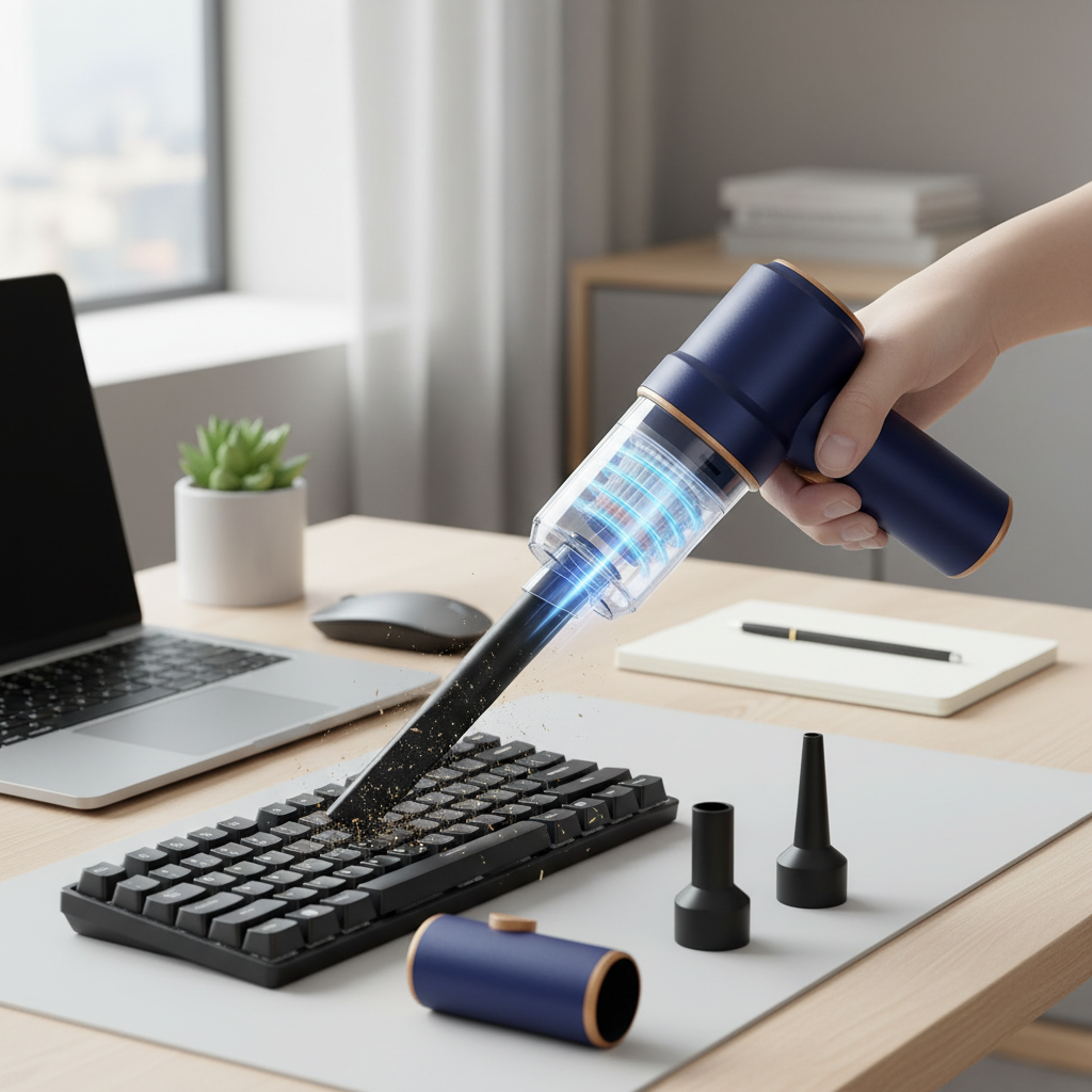 Basculez entre aspiration et soufflerie pour nettoyer claviers, voitures et espaces délicats sans effort.